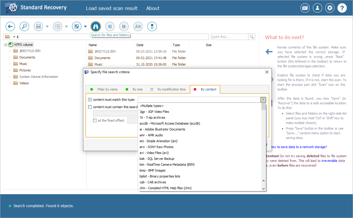 UFS Explorer now allows you to search for files based on their actual content, rather than relying solely on properties like filenames or sizes. This makes it possible to locate important files even when their names are missing or file system metadata got damaged. You can begin by specifying a file type to search for, choosing from a list of built-in types or using your own custom rules. Multiple file types can be selected simultaneously, enabling a more comprehensive search.