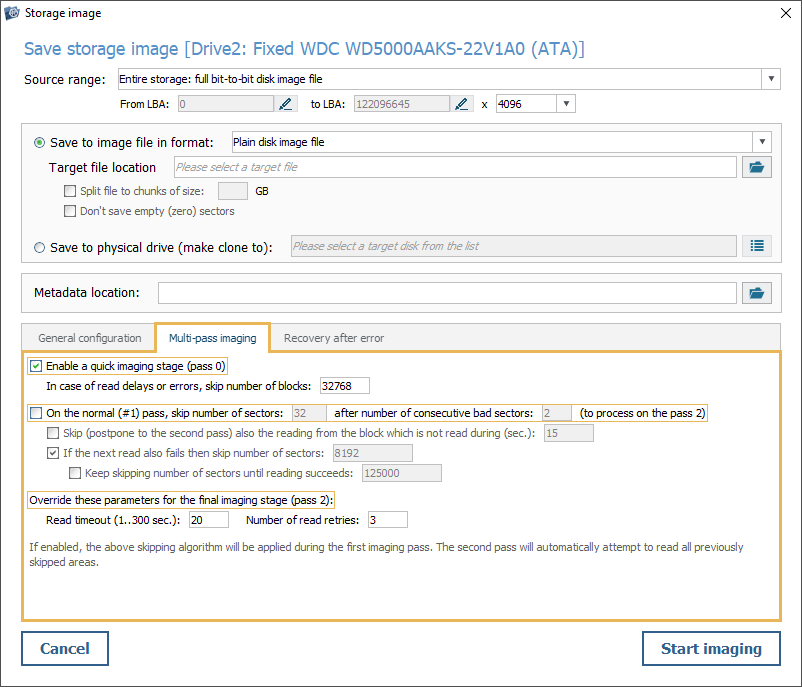 The imaging process has been optimized to handle drives with defects even more efficiently. A new optional preliminary imaging stage allows the software to quickly skip the damaged and hard-to-read areas that significantly slow down the procedure. This way, the imaging of intact regions can be accomplished much faster. Another optional stage is intended to go through the hard-to-read areas while leaving out defective ones, postponing them to the next imaging stage. Such an approach helps to avoid delays caused by problematic locations, making imaging much more speedy. During the final imaging stage, it is now possible to adjust the number of read retries and timeout settings.