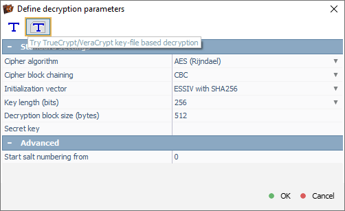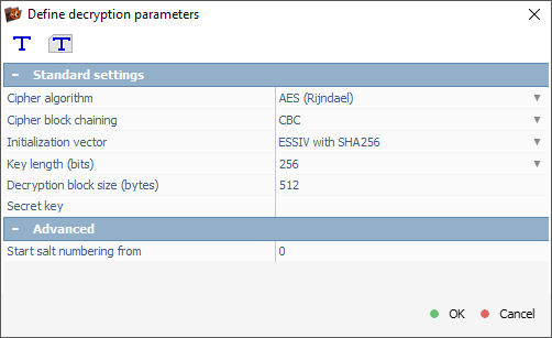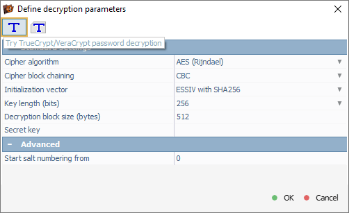 Andererseits bietet der allgemeine Entschlüsselungsdialog die Möglichkeit, den Entschlüsselungsprozess mithilfe erweiterter kryptografischer Parameter vollständig zu steuern. Dazu gehören der Verschlüsselungsalgorithmus (z. B. AES, Serpent, Twofish, Blowfish), der Verschlüsselungsmodus (CBC, ECB, XTS), der Initialisierungsvektor, die Schlüsselgröße (128, 192 oder 256 Bit), die Größe des Entschlüsselungsblocks (in Bytes) sowie der eigentliche kryptografische Schlüssel, der für die Entschlüsselung der Daten benötigt wird.