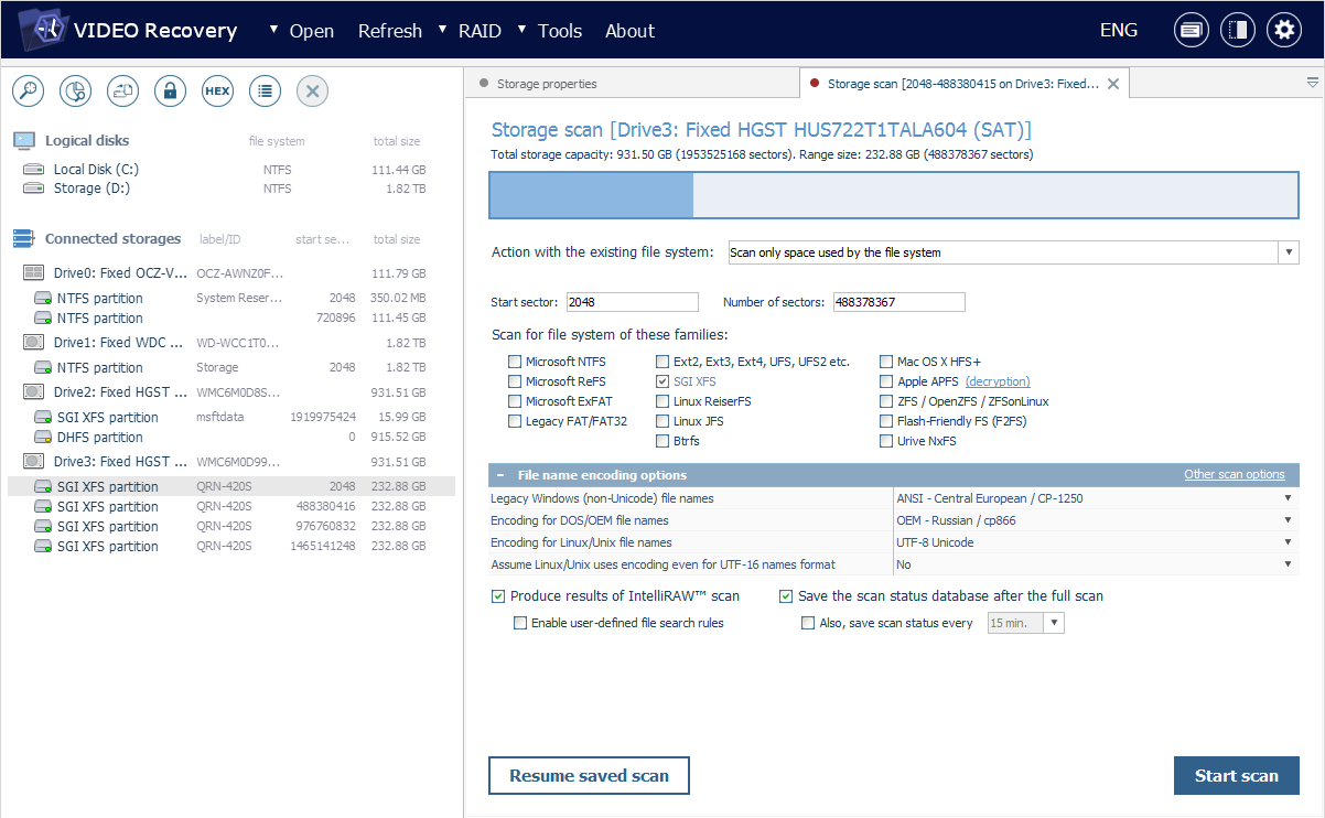 Die Schaltfläche "Fortsetzen des gespeicherten Scans" unten links auf der Registerkarte ermöglicht es, den Scan mit dem Fortschritt fortzusetzen, den er beim Speichern in einer Scanstatus-Datenbank-Datei hatte. Gehen Sie zum Speicherort der *.ssdb-Datei und klicken Sie auf "Öffnen". Der Prozess beginnt sofort an der Stelle, an der er gestoppt wurde.