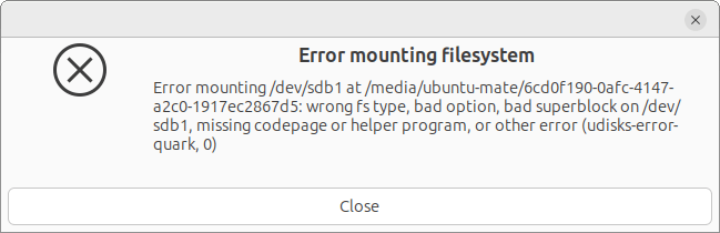 - Fehler beim Einhängen von /dev/sdb1 in /media/user/drive: falscher Dateisystemtyp, ungültige Option, fehlerhafter Superblock auf /dev/sdb1, fehlende Codepage oder Hilfsprogramm, oder ein anderer Fehler.