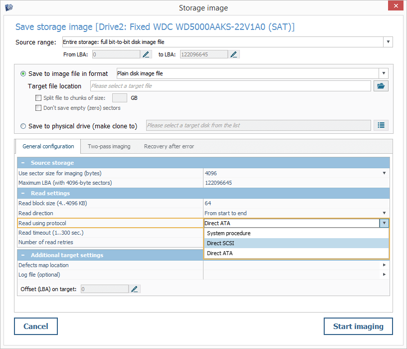 El "Procedimiento del sistema" estándar puede causar problemas, cuando la unidad no funciona de manera normal, y provocar una mayor degradación. Al encontrar un bloque defectuoso, el sistema operativo puede realizar intentos repetidos de acceder a esa área del disco para obtener los datos solicitados, lo que a menudo resulta en que la operación se bloquee y la unidad deje de responder. El procedimiento "ATA/SCSI directo" permite controlar el procesamiento de errores de lectura. Sin embargo, es posible que no se pueda activar para todos los dispositivos de almacenamiento y que no funcione en determinados sistemas operativos.