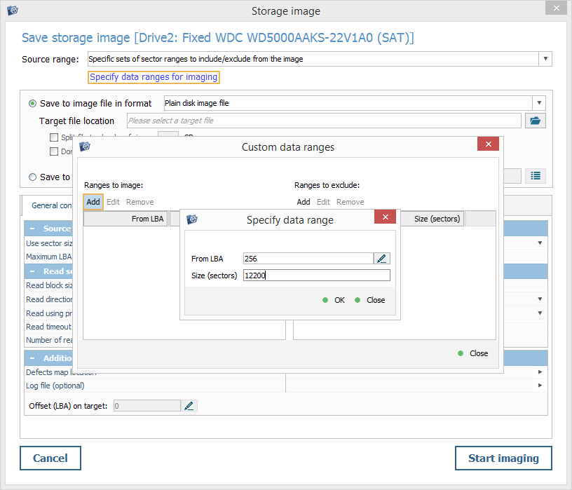 La opción "Múltiples rangos definidos por el usuario: conjunto de rangos para incluir/excluir de la imagen" se puede utilizar para definir los rangos en el almacenamiento para incluir/excluir de la imagen. Se recomienda elegir esta opción sólo cuando usted sabe exactamente cuáles áreas están dañadas y no deberían estar presentes, o cuando se debe leer un rango particular una vez más.