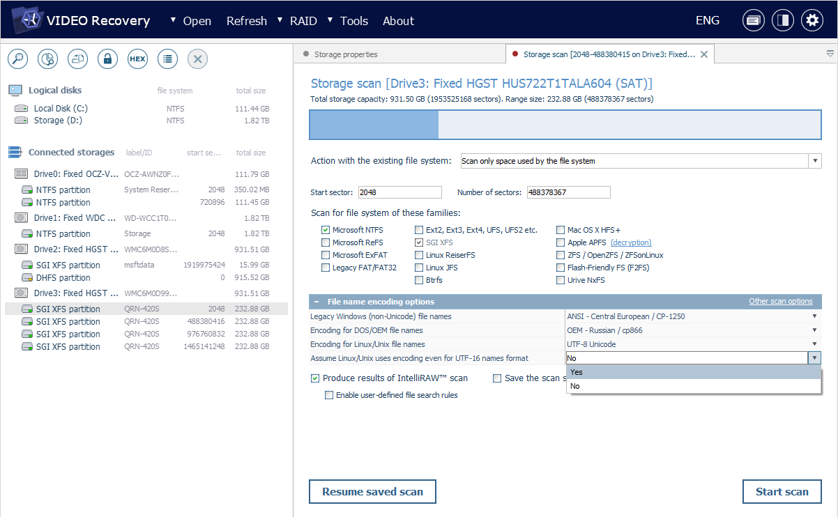 Si al explorar el sistema de archivos existente, no puede encontrar los vídeos necesarios, esto puede significar que se eliminaron o se perdieron del medio de datos. En este caso, debe seleccionar este almacenamiento o su partición en el panel de navegación por almacenamientos del programa e iniciar su escaneo en busca de datos faltantes. Sin embargo, tenga en cuenta, por favor, que un almacenamiento complejo o específico puede requerir un ensamblaje o una transformación preliminar para que se pueda escanear de manera adecuada.