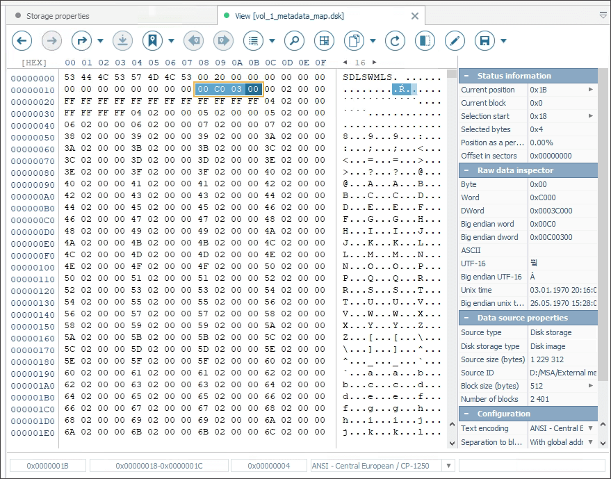 El archivo de mapa en sí se caracteriza por un formato específico. Se puede examinar su estructura utilizando el instrumento integrado Visor hexadecimal que se abre con la opción "Ver contenidos hexadecimales".