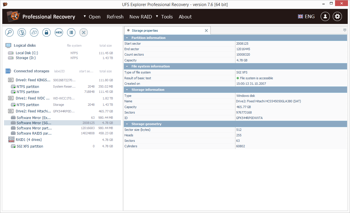 - SGI XFS: full support: data access, search for lost partitions, RAID recovery, recovery of deleted files, recovery after format, recovery after file system damage; support of NAS devices and custom servers.