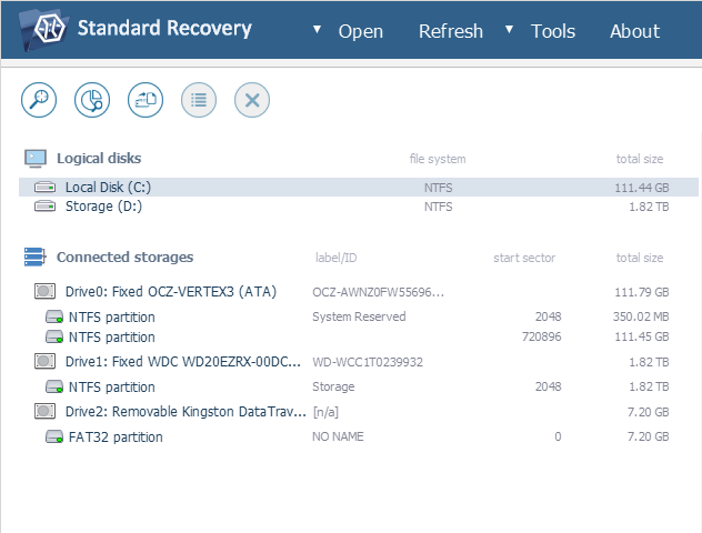 By default, the storages navigation pane contains all the detected physical storage devices connected to the local computer, provided that the software is launched with administrative privileges. The pane is refreshed automatically after the (re)start of the application. It can also be updated by request using the "Refresh" item in the main menu.