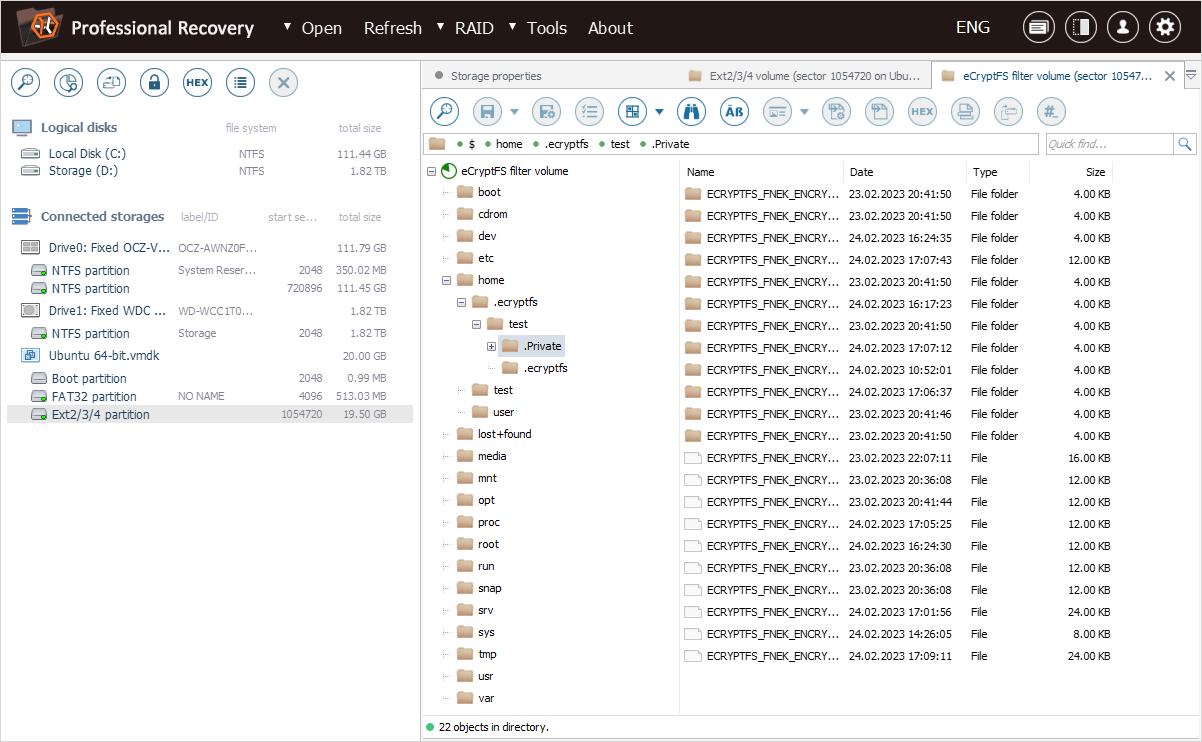 UFS Explorer Professional Recovery має усі необхідні функції для дешифрування даних, зашифрованих за допомогою eCryptfs різних конфігурацій, і подальшої безперебійної роботи з отриманим вмістом. Тож давайте подивимося, як працювати з різними випадками застосування eCryptfs за допомогою цього програмного забезпечення для відновлення даних. Але спершу, будь ласка, ознайомтеся з принципами роботи eCryptfs, описаними в окремій статті.
