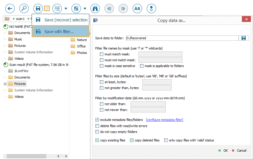 За допомогою Провідника ви також можете встановити фільтр для збереження файлів або папок. Для цього натисніть на опцію «Зберегти, застосовуючи фільтр…» інструмента «Зберегти (відновити) виділене» з головної панелі інструментів Провідника або на «Зберегти з фільтром…» у контекстному меню потрібного об’єкта. Додаткову інформацію про фільтри можна знайти в розділі Провідник (переглядач файлів).